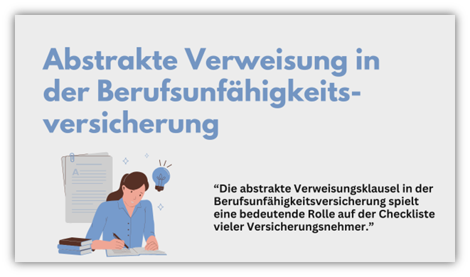Die Klausel der abstrakten Verweisung erlaubt es dem Versicherer zu überprüfen, ob du im Falle einer Berufsunfähigkeit, basierend auf deiner bisherigen sozialen Wertschätzung, deinem finanziellen Einkommen sowie Ausbildung und Fähigkeiten theoretisch in der Lage wärst, eine andere Tätigkeit auszuüben, unabhängig davon, ob diese Tätigkeit aktuell ausgeübt wird oder ein entsprechender Arbeitsplatz verfügbar ist.