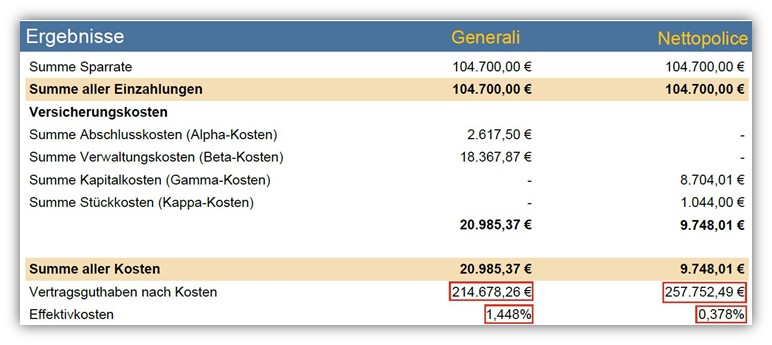 Deutlich wird der Unterschied bei den Effektivkosten und deren Einfluss auf die Ablaufleistung. Bei der Generali ergeben sich Effektivkosten auf Versicherungsebene ohne Berücksichtigung der Fondskosten von rund 1,45 %. Die Nettopolice weist auf Versicherungsebene Kosten von 0,38 % aus.
