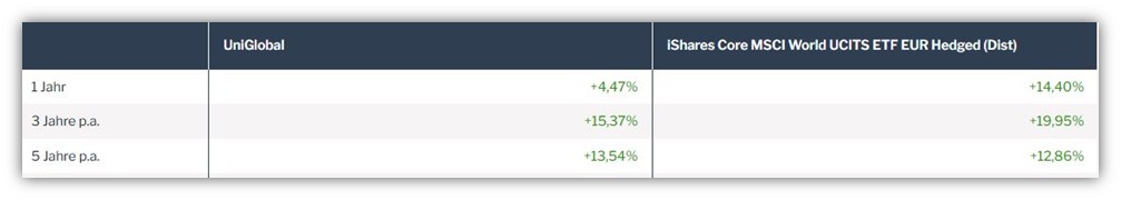 An dieser Stelle möchten wir noch einmal hervorheben, dass wir in unserem Vergleich von einer angenommenen Wertentwicklung beider Fonds von 6 % pro Jahr ausgegangen sind und die jeweiligen Fondskosten berücksichtigt haben. Dieser Vergleich ist bewusst vereinfachend dargestellt, da die tatsächliche historische Entwicklung je nach Zeitraum variiert. Mal schnitt der aktiv gemanagte UniGlobal etwas besser ab, mal der ETF.