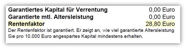 - Garantierter Rentenfaktor: 28,80 € (R+V) bzw. 28,74 € (Honorartarif)