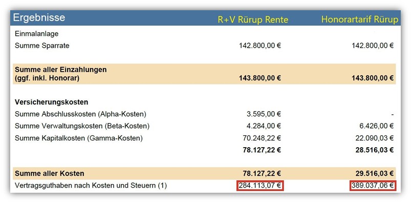 Damit liegt die garantierte Monatsrente im honorarbasierten Tarif um rund 299 € höher, also etwa 37 % mehr bei gleichen Einzahlungen und identischer Wertentwicklung.