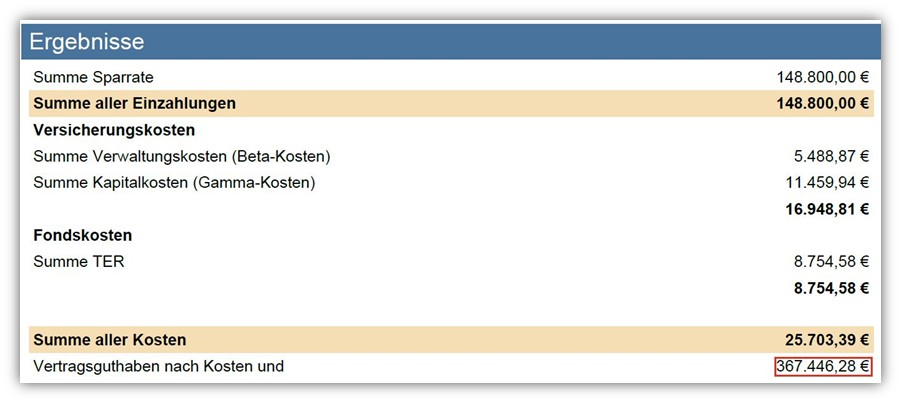 - Beta-Kosten von 4,40 % bei hoher monatlicher Beitragszahlung vergleichsweise hoch Hier empfiehlt sich die Arbeit über Sonderzahlungen, um Kosteneffizienz zu erzeugen