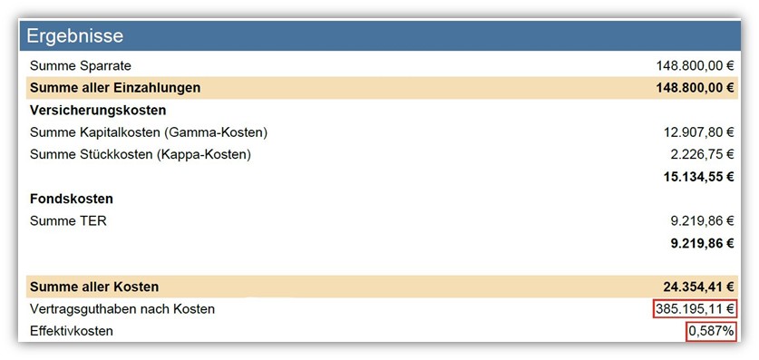 Wichtig: Diese Kosten für Sonderzahlungen werden in den ausgewiesenen Effektivkosten der Versicherung nicht berücksichtigt. Welchen Einfluss die Kosten für Sonderzahlungen auf die tatsächliche Rendite haben, zeigen wir im weiteren Verlauf des Artikels.