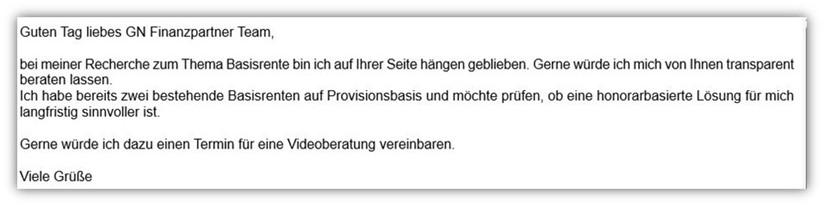Wenn du dich in einer dieser Gruppen wiedererkennst oder einfach eine zweite Meinung zu deinem bisherigen Angebot möchtest, kannst du dich gerne bei uns melden. Du erreichst uns unter info@gn-finanzpartner.de oder über unser Kontaktformular.