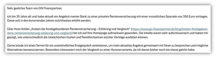 Solche Fälle erleben wir immer häufiger, besonders im Zusammenhang mit Rentenversicherungen der Zurich. Kundinnen und Kunden der Postbank und der Deutschen Bank wenden sich regelmäßig an uns, um ihre Angebote prüfen zu lassen.